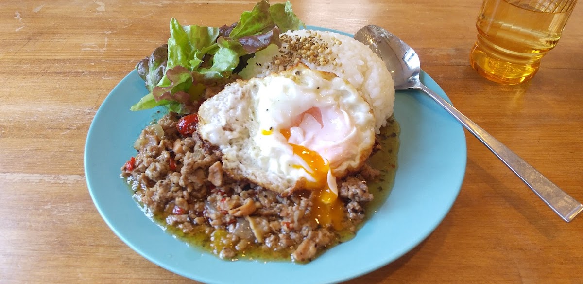 Alongside the hearty curries, there are also lighter highlights like naturally fermented yeast hamburgers and classic Thai-influenced gapao rice, balancing out the menu with different flavors. Desserts such as Basque cheesecake, along with carefully brewed coffee and refreshing iced coffee, complement the savory dishes well. One detail that stands out is the house pickles served alongside the curry — tangy and fresh, they can be enjoyed solo or mixed in for extra depth.