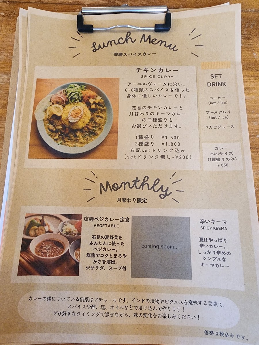 The food items are primarily organized around lunch dishes and desserts, with a focus on curry variants including medicinal and keema styles. The lunch menu includes one or multiple curry offerings, often changing monthly, providing some variety. Customers may find options such as two or three kinds of curry served together.